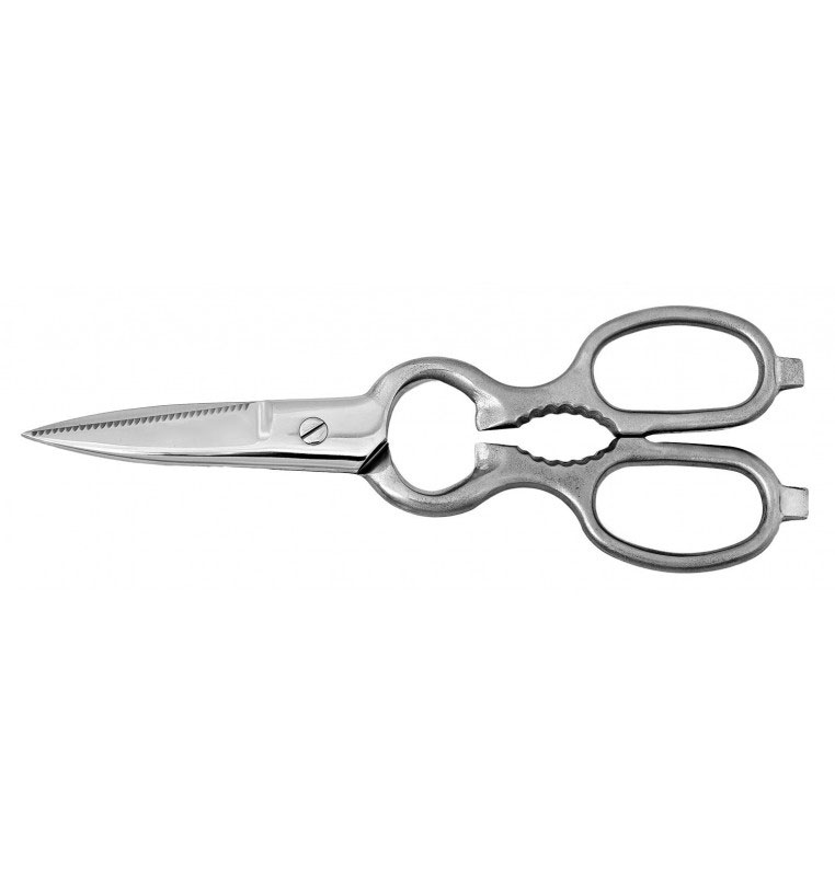 Multi-purpose scissors, two serrated blades, sandblasted handles (unpainted).